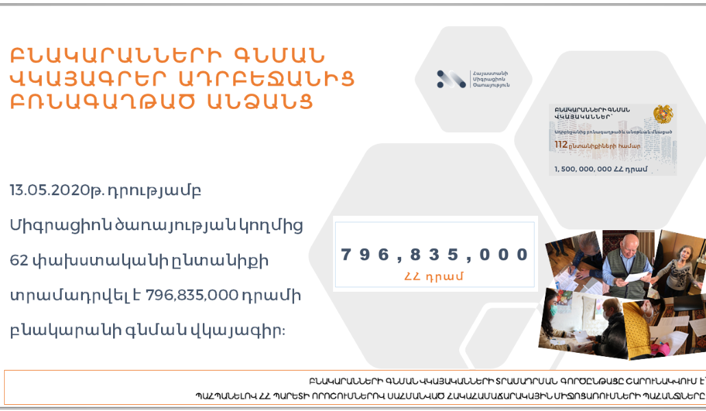 Այդպիսով, Ադրբեջանից բռնագաղթած և անօթևան մնացած 112 ընտանիքներին տրամադրվում են բնակարանի գնման վկայականներ։ Մասնավորապես, ծրագրի իրականացման համար հատկացվել է մոտ 1,5 մլրդ դրամ։ Վկայագրի միջոցով բնակարանի ձեռքբերման ժամկետը սահմանվում է 1 տարի։
