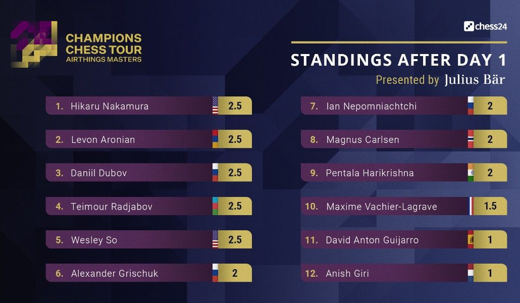 Աջակցիր «Ա1+»-ինԱյսօր մեկնարկեց առցանց անցկացվող արագ շախմատի Airthings Masters մրցաշարը, որին մասնակցում են 12 գրոսմայստեր, այդ թվում Հայաստանի ուժեղագույն շախմատիստ Լևոն Արոնյանը: