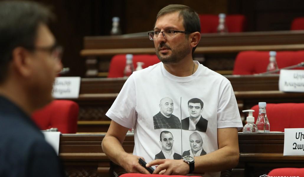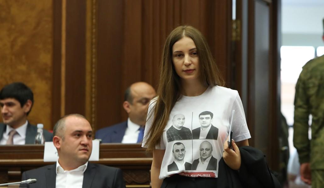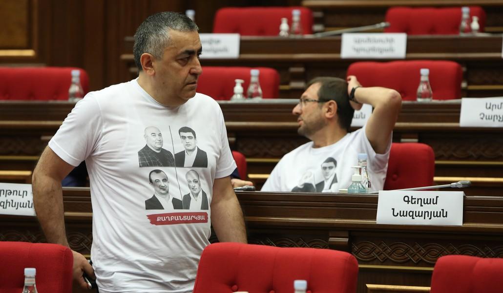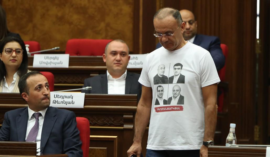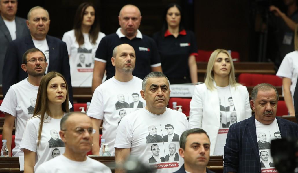 Խորհրդորան անցած երկրորդ ուժի՝ «Հայաստան» դաշինքի պատգամավորները՝ այդ թվում խմբակցության ղեկավար Սեյրան Օհանյանը նիստին եկել էին միանման շապիկներով, որոնց վրա Սյունիքի կալանավորված համայնքապետերի նկարներն էին։