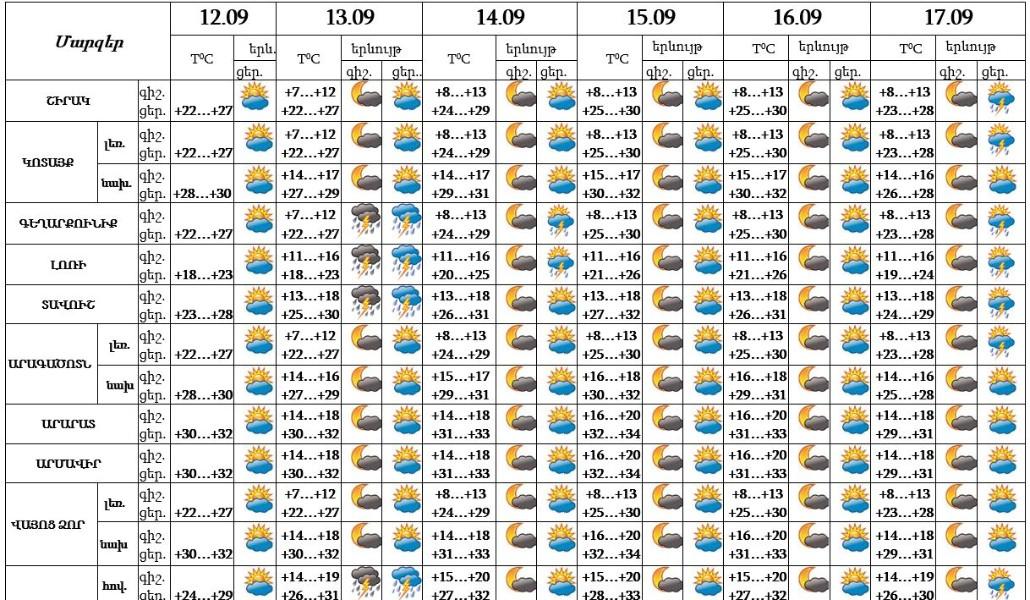 Սեպտեմբերի 12-ի ցերեկը, 15-16-ը սպասվում է առանց տեղումների եղանակ: Սեպտեմբերի 13-14-ը, 17-ին՝ առանձին շրջաններում՝ հիմնականում գիշերը և կեսօրից հետո, սպասվում է անձրև և ամպրոպ: