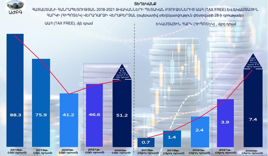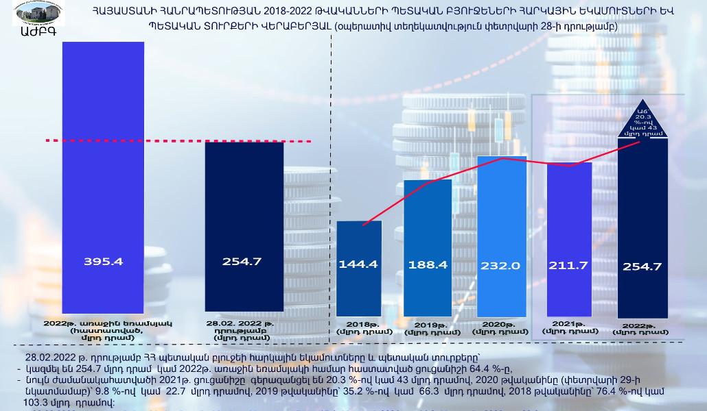 Եվ այսպես՝ 28․02․2022 թ․ դրությամբ ՀՀ պետական բյուջեի հարկային եկամուտները և պետական տուրքերը կազմել են 254․7 մլրդ դրամ, որը նույն ժամանակահատվածի 2021թ․ ցուցանիշը գերազանցել են 20․3 %-ով կամ 43 մլրդ դրամով, 2020 թվականինը (փետրվարի 29-ի նկատմամաբ)՝ 9․8 %-ով կամ 22․7 մլրդ դրամով, 2019 թվականինը՝ 35․2 %-ով կամ 66.3 մլրդ դրամով, 2018 թվականինը՝ 76.4 %-ով կամ 103․3 մլրդ դրամով։