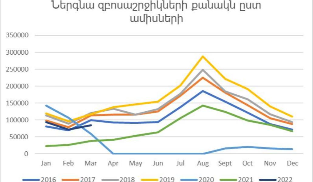 Աջակցիր «Ա1+»-ին2022 թվականի առաջին եռամսյակում Հայաստան այցելած զբոսաշրջիկների քանակը 250,798 է, 2021-ի նույն ժամանակահատվածում՝ 87,131, 2019-ին՝ 333,150։ Այս մասին իր ֆեյսբուքյան էջում գրել է էկոնոմիկայի նախարար Վահան Քերոբյանը։