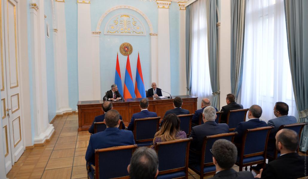 Հանդիպման ընթացքում Հանրապետության նախագահն անդրադարձել է Հայաստանի տնտեսական իրողություններին, տնտեսության ոլորտում իրականացվող բարեփոխումներին, որոնք միտված են նաև գործարար դաշտի համար տնտեսական միջավայրն առավել գրավիչ դարձնելուն, նոր տեխնոլոգիաների ու թվայնացման համակարգերի ներդրմանը:
