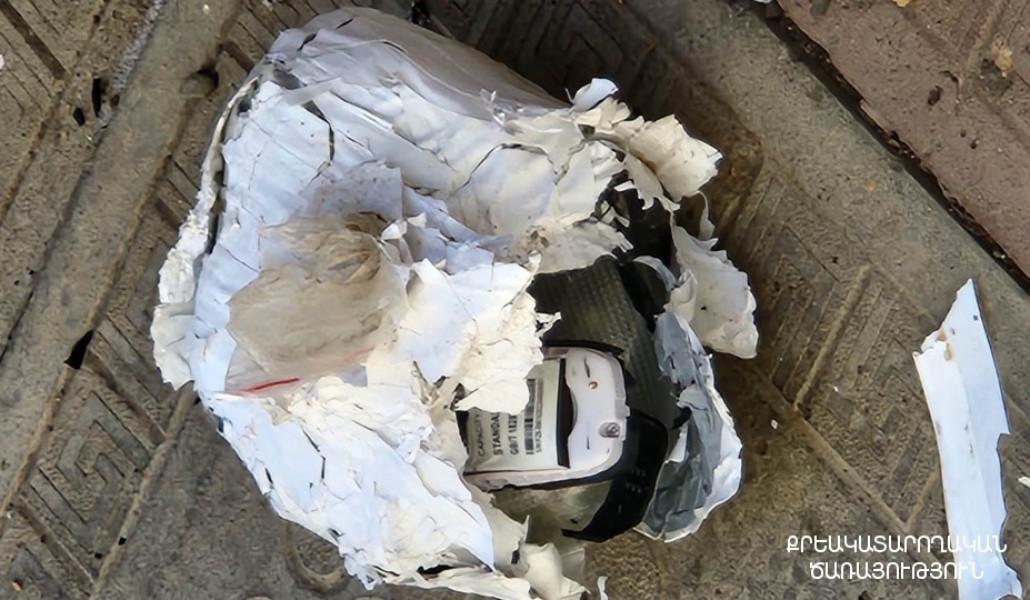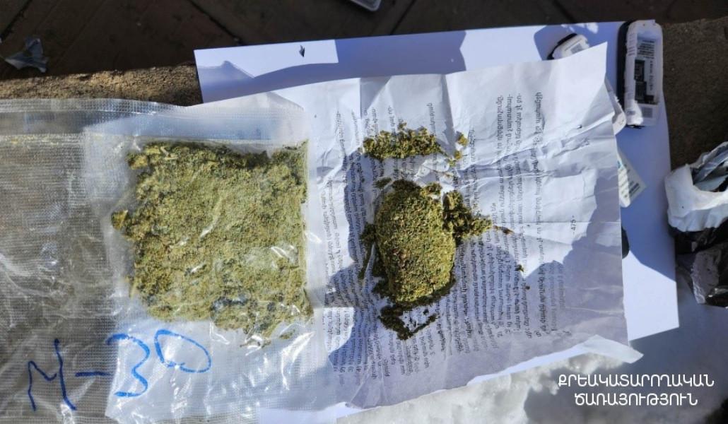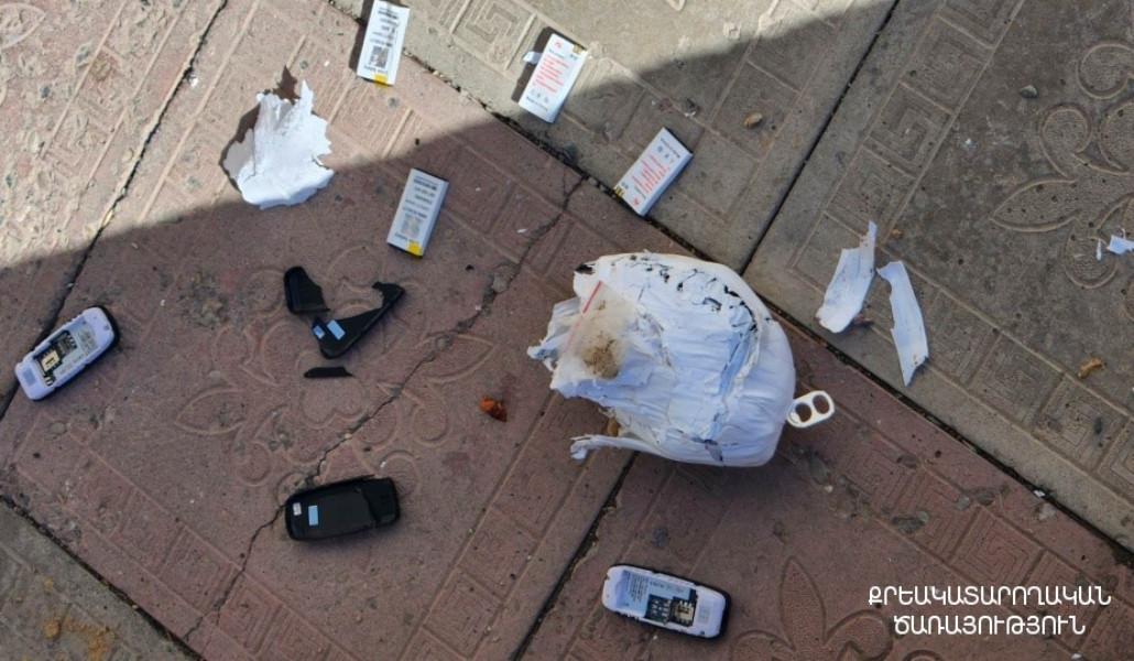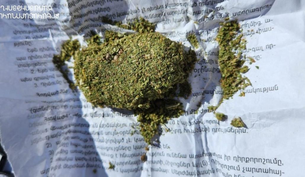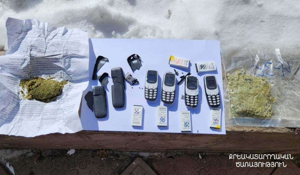 Փաթեթի զննությամբ հայտնաբերվել են ընդհանուրը 7․55 գրամ շագանակագույն, փոշենման, կոշտացած զանգվածներ, 2 առանձին փաթեթներով, ընդհանուրը 41․49 գրամ քաշով մարիխուանա տեսակի թմրամիջոցին նմանվող կանաչ, մանրացված չոր զանգվածներ, բջջային հեռախոսի 6 մարտկոց և 4 բջջային հեռախոս, որոնցից 3-ը վնասվել են հեռակառարվող անօդաչու թռչող սարքի բարձր լինելու պատճառով։