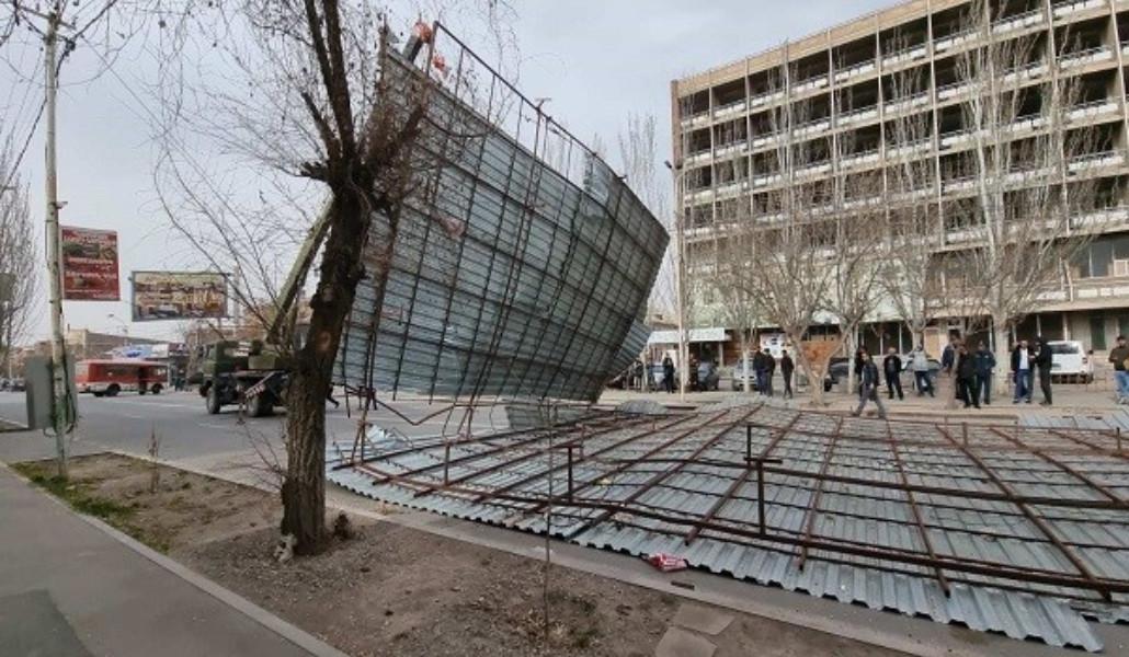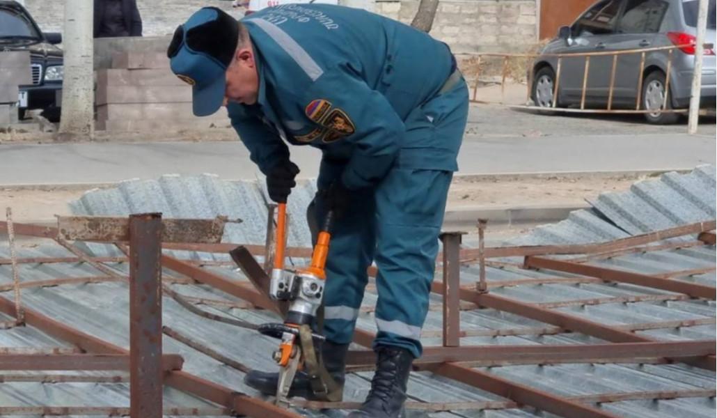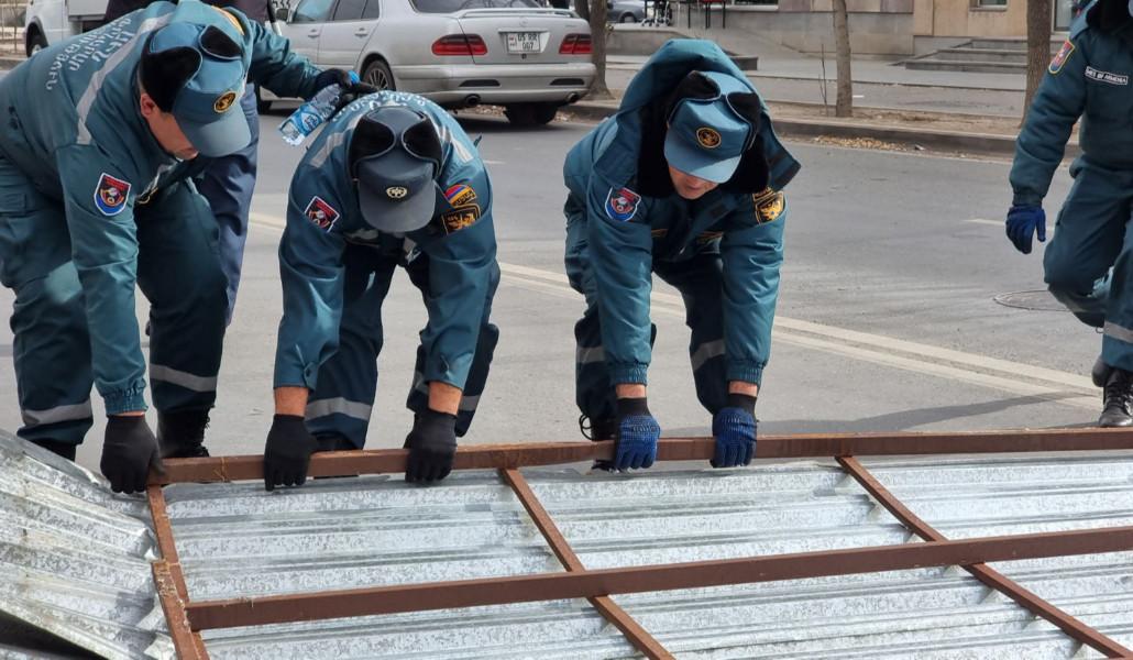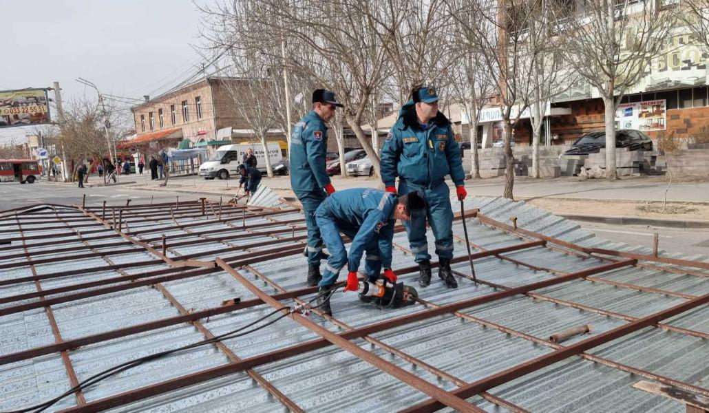 Փրկարարները հատուկ տեխնիկայի միջոցով ապամոնտաժել են պոկված տանիքի կառուցատարրերը և հեռացրել ճանապարհի երթևեկելի հատվածից: