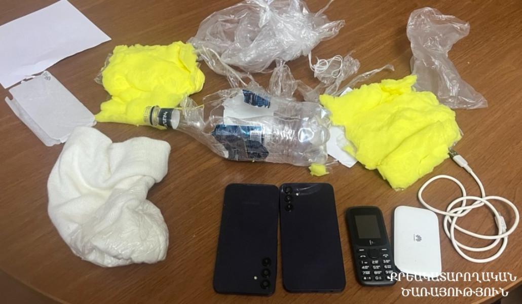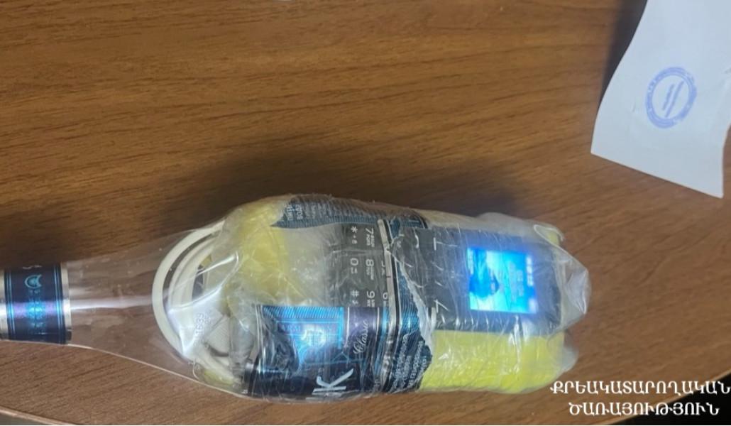 Ծառայողներն անմիջապես զննել են նշված հատվածը և հայտնաբերել ներնետված փաթեթը, որում առկա են եղել պլաստմասե շշի մեջ սպունգով փաթեթավորված 3 բջջային հեռախոս, wi-fi սարք և լիցքավորման լար։