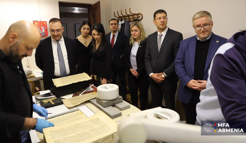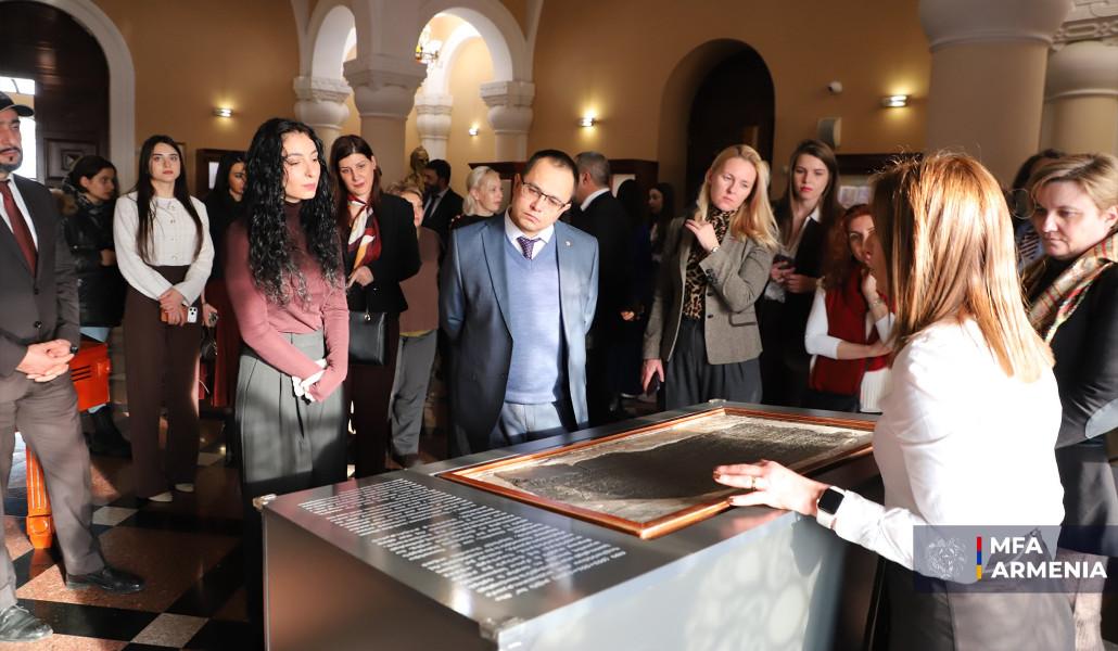 Մատենադարան Մ. Մաշտոցի անվան հին ձեռագրերի գիտահետազոտական ինստիտուտում տեղի է ունեցել Հայաստանի Հանրապետությունում հավատարմագրված օտարերկրյա դիվանագիտական ներկայացուցչությունների համար ՀՀ արտաքին գործերի նախարարության կողմից կազմակերպված մշակութային դիվանագիտության թեմատիկայով հերթական միջոցառումը։
