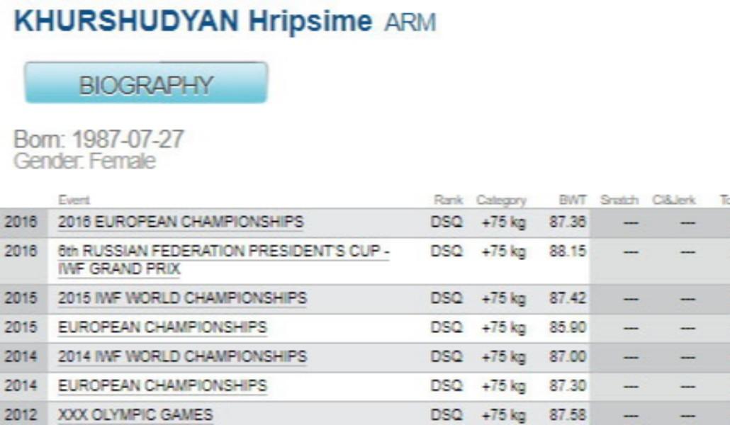 Поддержи А1+!Международная федерация тяжелой атлетики отменила все результаты, продемонстрированные Рипсимэ Хуршудян, которые она зафиксировала после 2008 года. Это значит, что она механически лишилась всех титулов, которые завоевала в течение 20008-2016 годов.