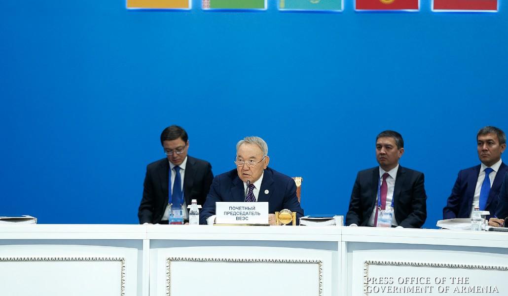 На встрече в узком составе президент Казахстана Касим-Жомарт Токаев заявил о присвоении первомупрезиденту Казахстана - Нурсултану Назарбаеву звания Почетного председателя Евразийского экономического союза и награждении его орденом “За вклад в развитие Евразийского экономического союза” с учетом его исторического вклада в становление Евразийского экономического союза. Премьер-министр Армении Никол Пашинян на заседании выступил с речью.