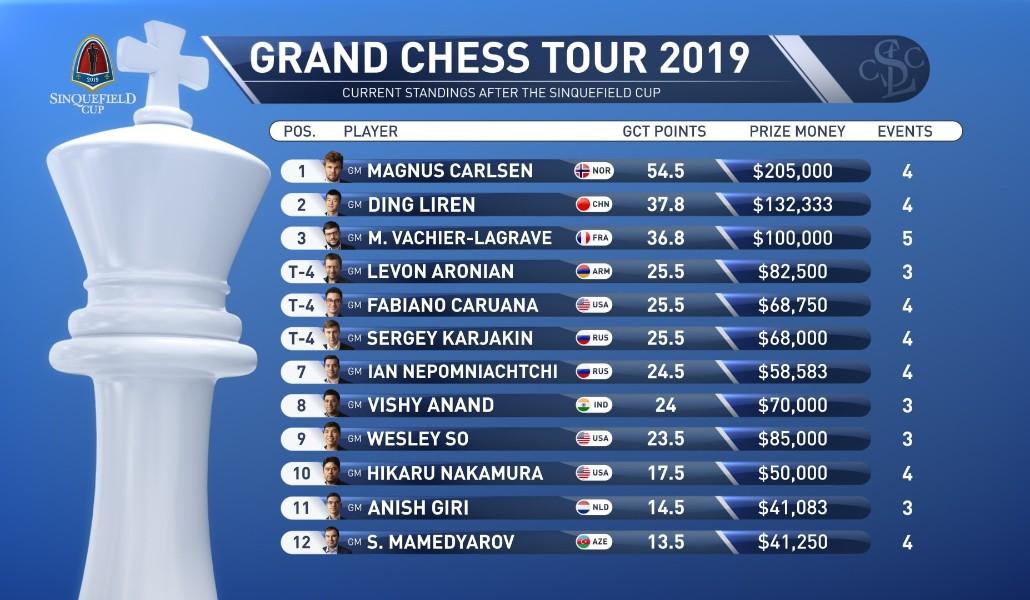 Добавим, что после 50-и этапов, уже состоявшихся в рамках Grand Chess Tour-а, турнирную таблицу с 54.5 очками возглавляет действующий чемпион мира Магнус Карлсен. Левон Аронян с американцем Фабиано Каруаной и россиянином Сергеем Карякиным сейчас делат 4-6-е места, однако наш шахматист провел на один этап меньше.