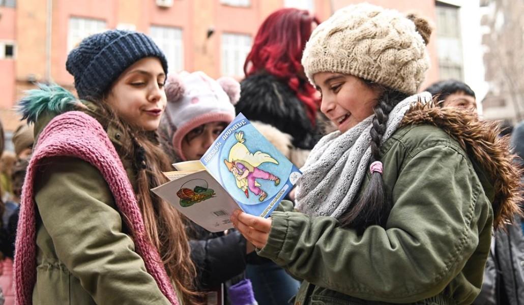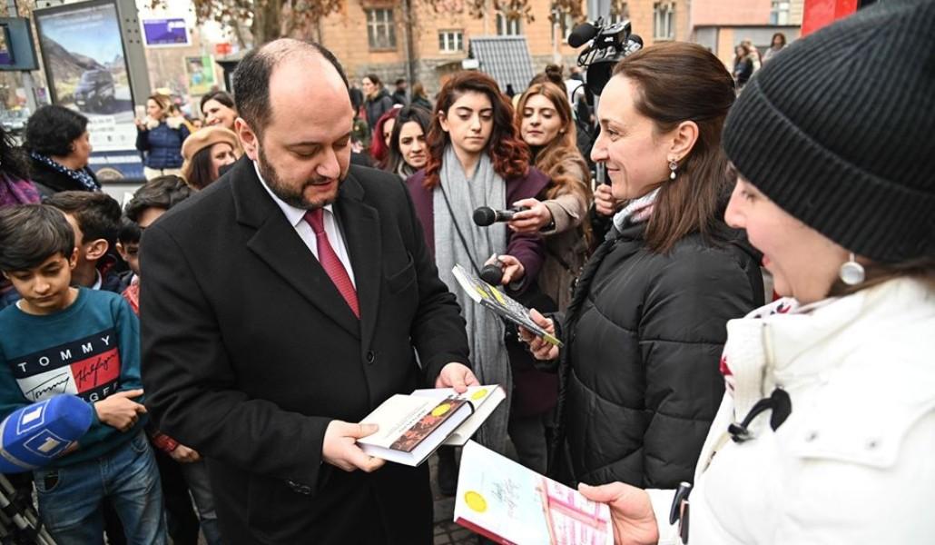 Поддержи А1+!День рождения Ованеса Туманяна, 19 февраля, отмечается в Армении как День дарения книги. В связи с этим министр образования, науки, культуры и спорта Араик Арутюнян рядом с Национальной детской библиотеки им. Хнко Апера дарил прохожим произведения представителей армянской и зарубежной литературы. Он принял участие в 16-ой Ереванской ярмарке-выставке детско-юношеской книги и читал детям сказки.