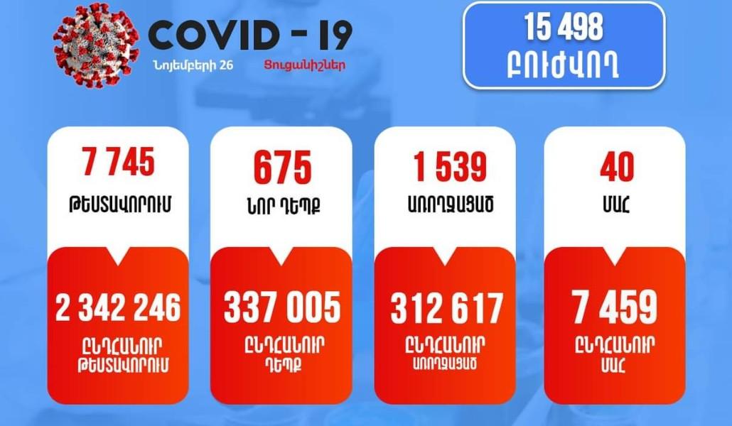 За прошедшие сутки проведено 7745 анализов, подтверждено 675 новых случаев заболевания коронавирусом, 1539 граждан выздоровели, зарегистрировано 40 смертей.