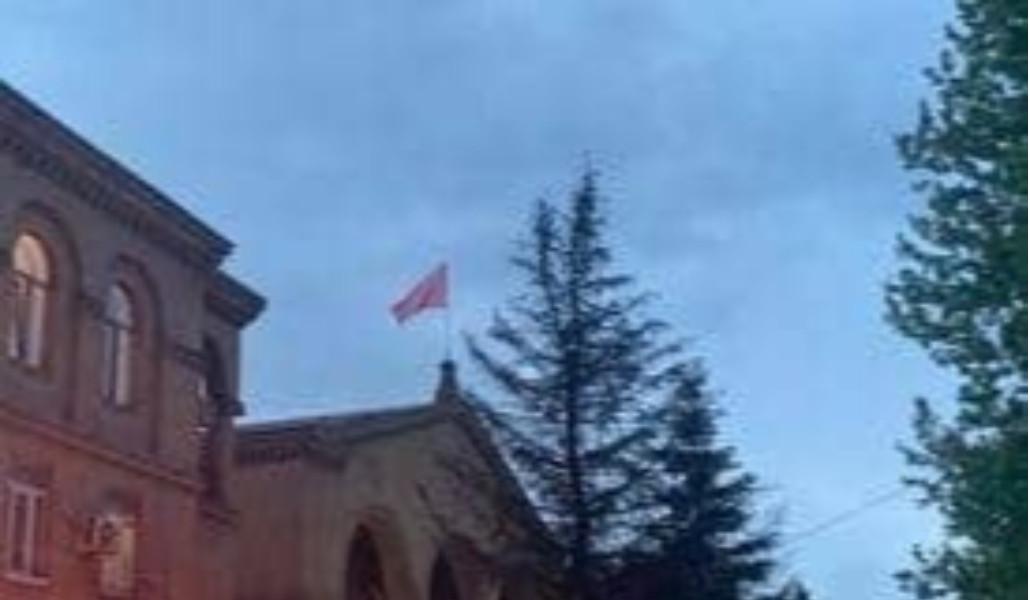 Корреспондент «А1+» сделал несколько фотографий, на которых видно, что на крыше здания развевается советский красный флаг.